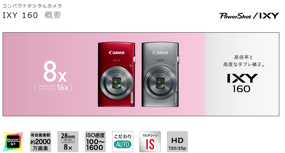 [amazonjs asin=”B012CB09ZA” locale=”JP” title=”Canon デジタルカメラ IXY160 シルバー 光学8倍ズーム IXY160(SL)”]