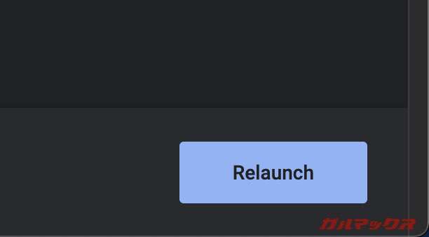 ▼4.その後は下部に「再起動すると変更が適用されます」的な文言が出てくるんで青い再起動(ReLaunch)ボタンを押す。なお再起動する前に、記事やWikiなどの執筆といった未保存のコンテンツは予め保存しておきましょう。↓