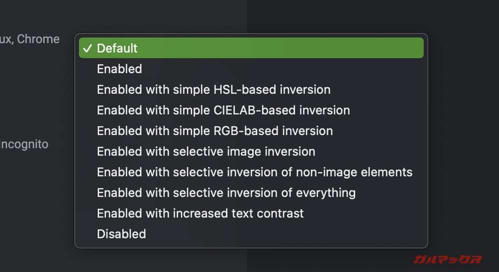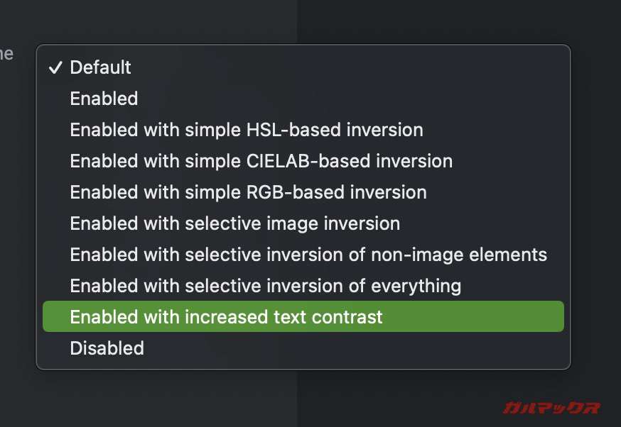 ▼手順3で紹介した「Auto Dark Mode for Web Contents」のあるプルタウンメニューにアクセスし「Default」を選択。その後再起動すればもとに戻ります。↓