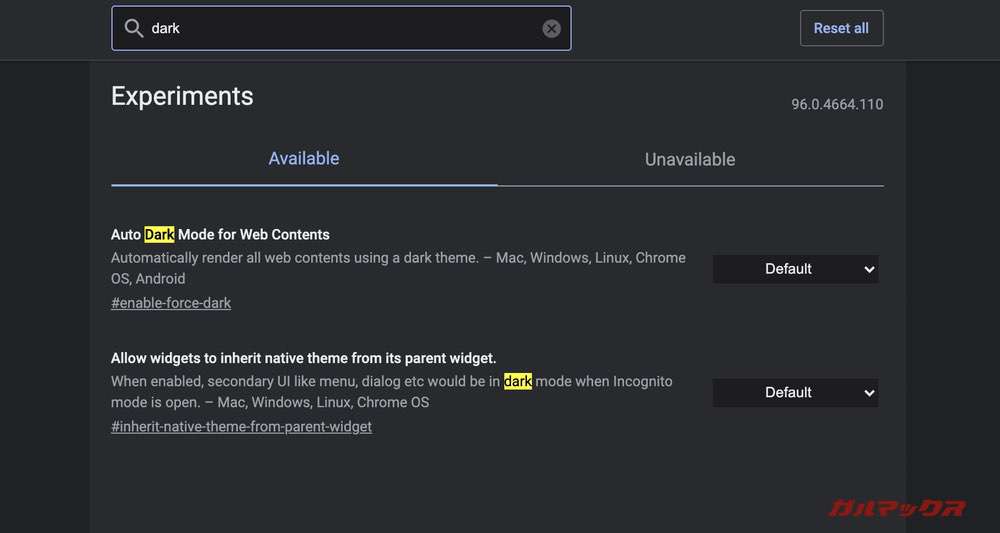 ▼2.ページ内の単語検索バーに「dark」を入力。すると「Auto Dark Mode for Web Contents」項目が出てくる。画像では上の項目。↓