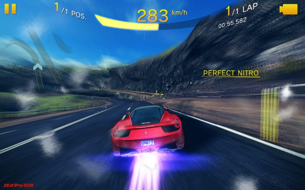 ▼数年前にリリースされているゲームですが、このクラスなら快適に動作します。また、ジャイロセンサーも備えているので、端末の傾きでハンドル操作も可能。↓