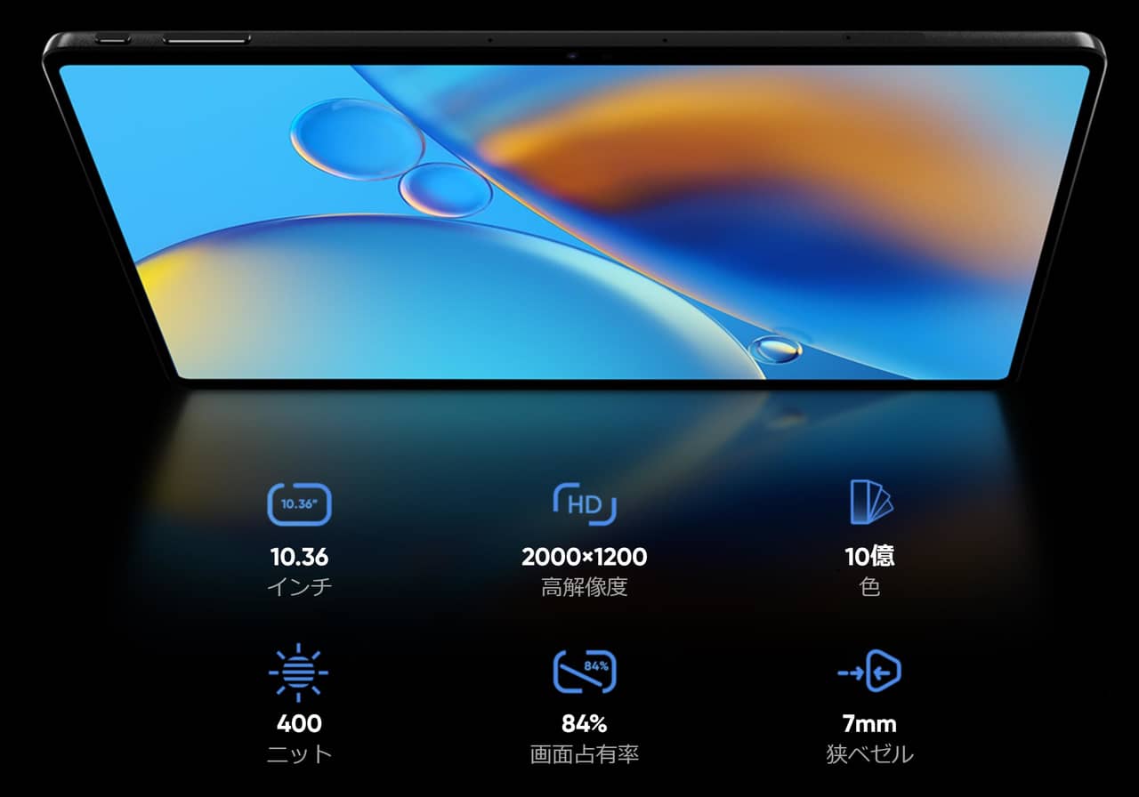 ▼ディスプレイは10.36インチと大きめ!解像度は2,000×1,200のWUXGA+クラスかつ10億色表示に対応しており、かなり色彩・見栄えの良さに期待できるスペックとなっています!↓