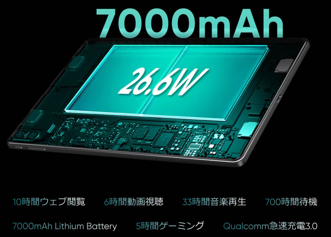 ▼バッテリー容量は7,000mAh。WEBブラウジングは10時間、動画視聴は6時間とけっこうな電池持ちとなっているのは良いっすね(`・ω・´)。あと急速充電にも対応しているのもGood!↓