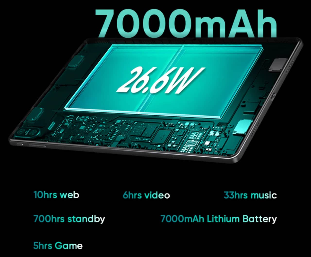 ▼バッテリー容量は7,000mAhの大容量!動画再生は連続6時間と結構電池持ちもいい感じっすね。↓