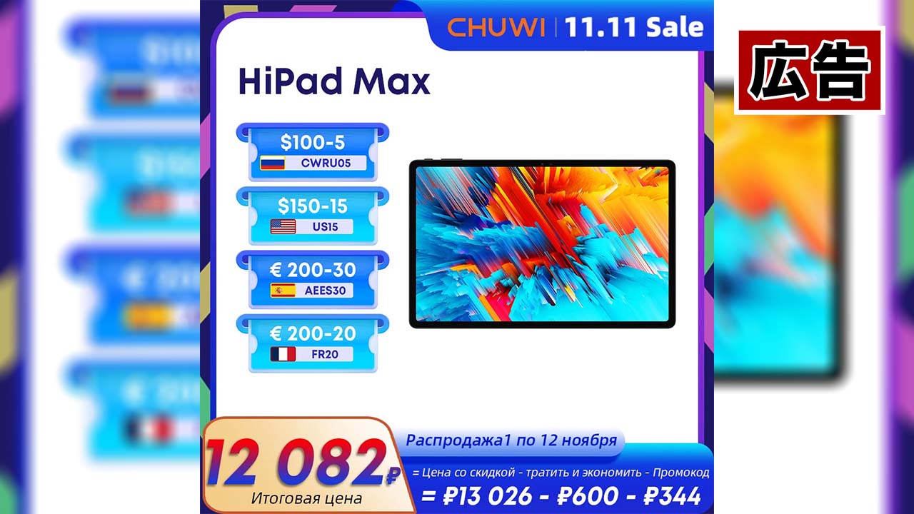 CHUWI HiPad Maxのセール価格は175.99ドル(約2.5万円)!ミドルクラスの処理性能を持っててSIMも使えてWidevine L1対応のモデルとしてはかなりの安さですよ!