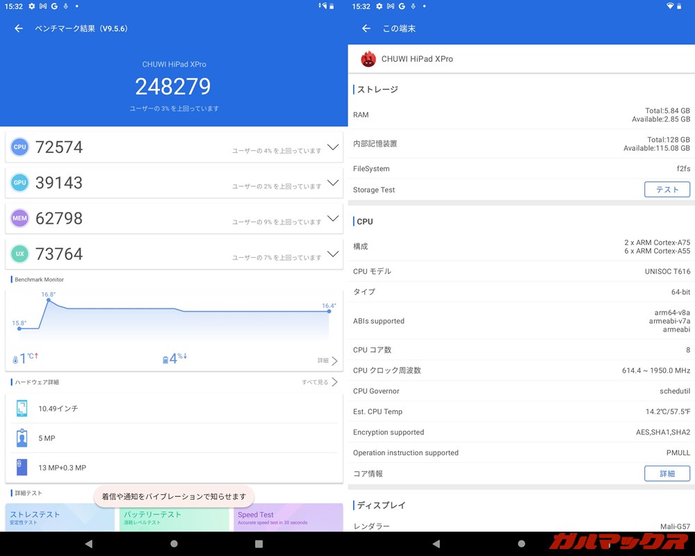 CHUWI HiPad XProには、UNISOC T616と最近のミドルレンジのAndroidタブレットでこぞって採用されているSoCが搭載されています。