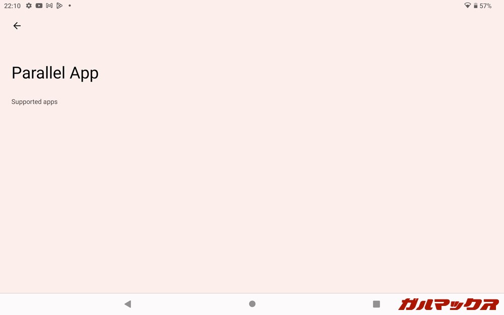 ▼設定の「アプリ」内にParallel Appという項目があるんですが、サポートしているアプリが何も表示されないんですよね。恐らくアプリクローンだと思うんですが、この状態ではホントに謎機能です。↓