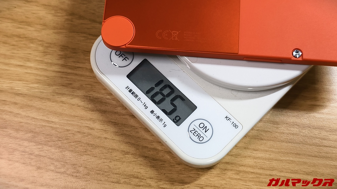 ▼大きさ自体は今どきらしいデカさなんだけど、重さは200gを切っており見た目よりは軽い印象を受けました。一応重量185gなので軽量級と言えるかは微妙なラインながら、筆者的には200g超えが当たり前だったのでそういう意味では軽く感じる。↓