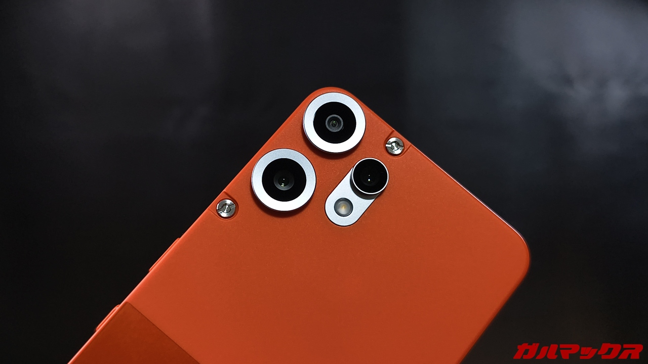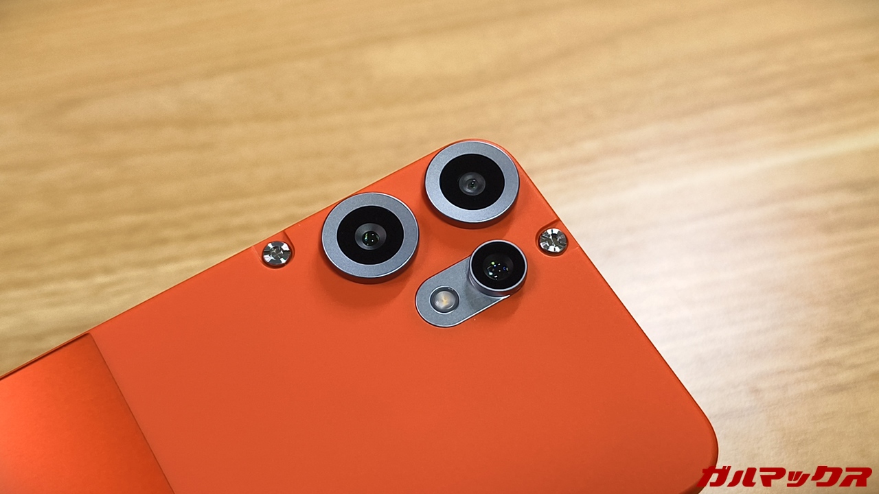 ▼カメラは周辺が銀色のアクセントパーツに覆われてます。ここもツール感あって好き。位置はかなり隅っこに寄っているんで初見では違和感を覚えた。↓
