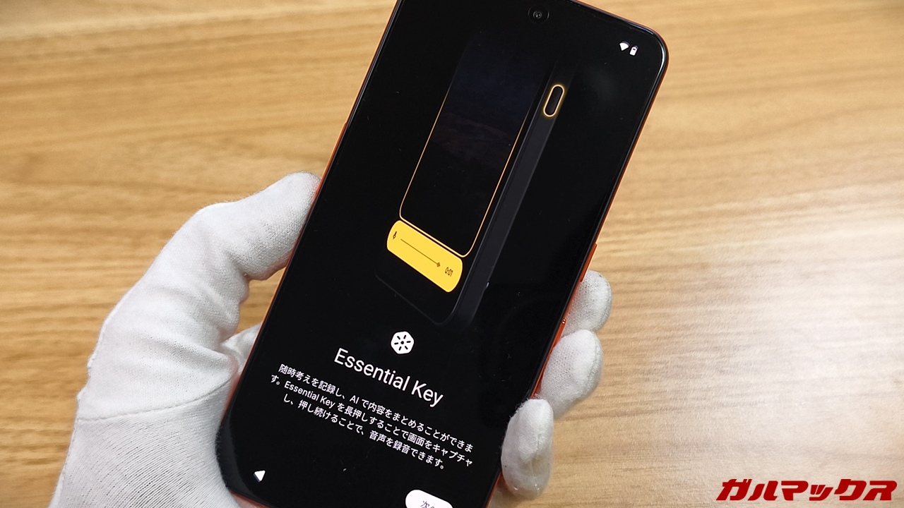 ▼本機の特徴の1つがこの独自キーであるEssential Key。電源キーの下にあるゴムっぽい質感のボタンです。↓