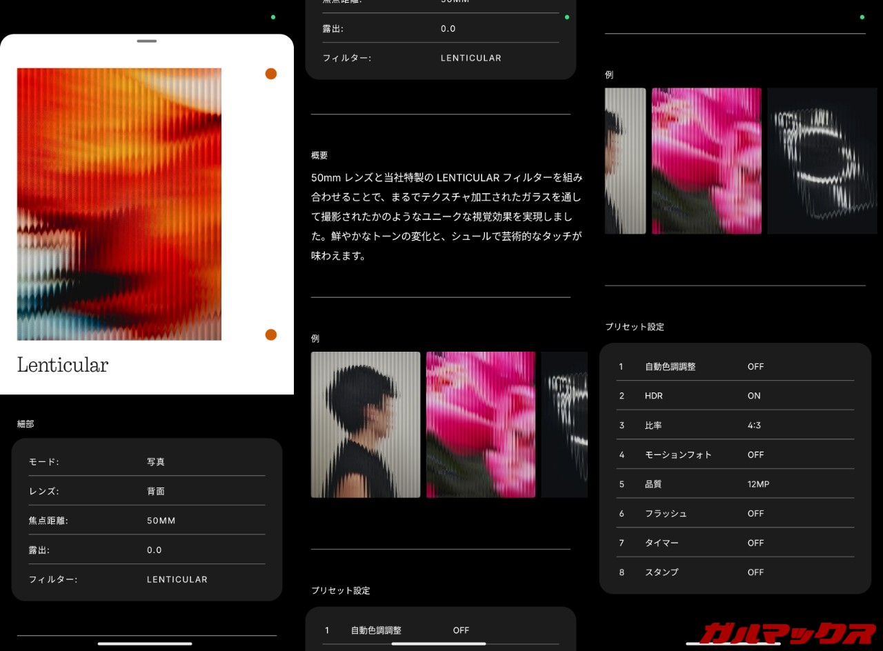 ▼本機の特徴の1つに撮影時のフィルターがあります。他のスマホでも対応しているんだけど、このCMF Phone 2 Proはプリセットの説明が丁寧だったり、Lenticularっていうウェーブじみたエフェクトが用意されていたり。↓