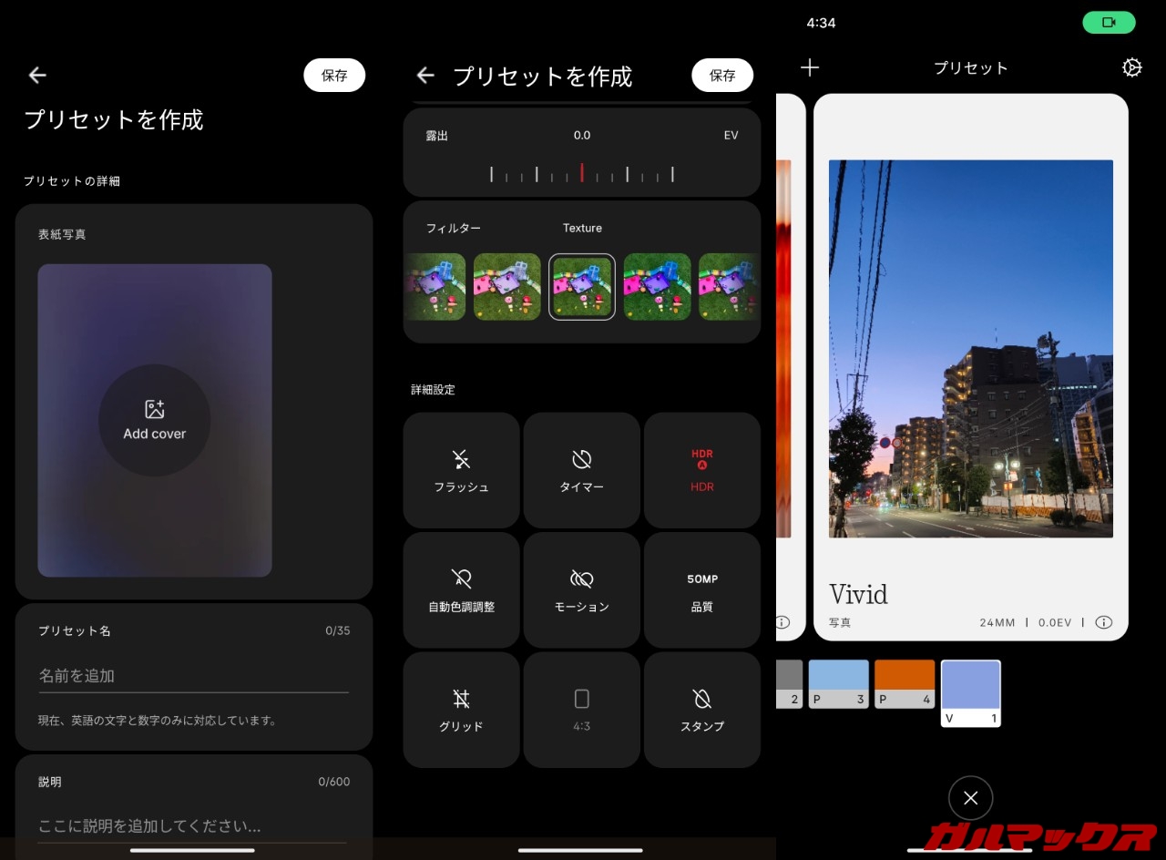▼プリセットの作成も可能。露出とかエフェクト、色味にタイマー設定などなど、すんごい細かいカスタマイズが可能。実際撮影した写真をカバー写真にもできます。ただし名前は英数字のみ限定なのがちと残念。↓