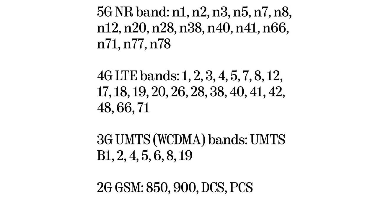 | 5G NR | Sub6:n1 / n2 / n3 / n5 / n7 / n8 / n12 / n20 / n28 / n38 / n40 / n41 / n48 / n66 / n77 / n78 | Sub6:n1 / n3 / n5 / n7 / n8 / n12 / n20 / n28 / n38 / n40 / n41 / n66 / n71 / n77 / n78 |
