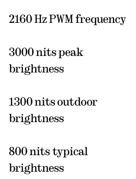 輝度は3000nitと記載されてますが、これはピーク輝度(閃光のように画面の一部がピカッと光る演出時に一瞬だけ出せるピークの輝度)。スペック表を確認すると屋外では1300nitまでみたいなので常用できるのはこのあたり。↓