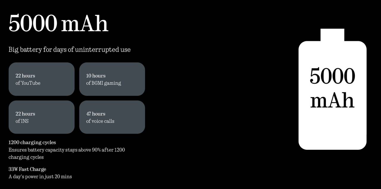 バッテリー容量は5,000mAhで充電は33Wの急速充電に対応!…なんですが、仕様は前モデルのCMF Phone 1から据え置き。