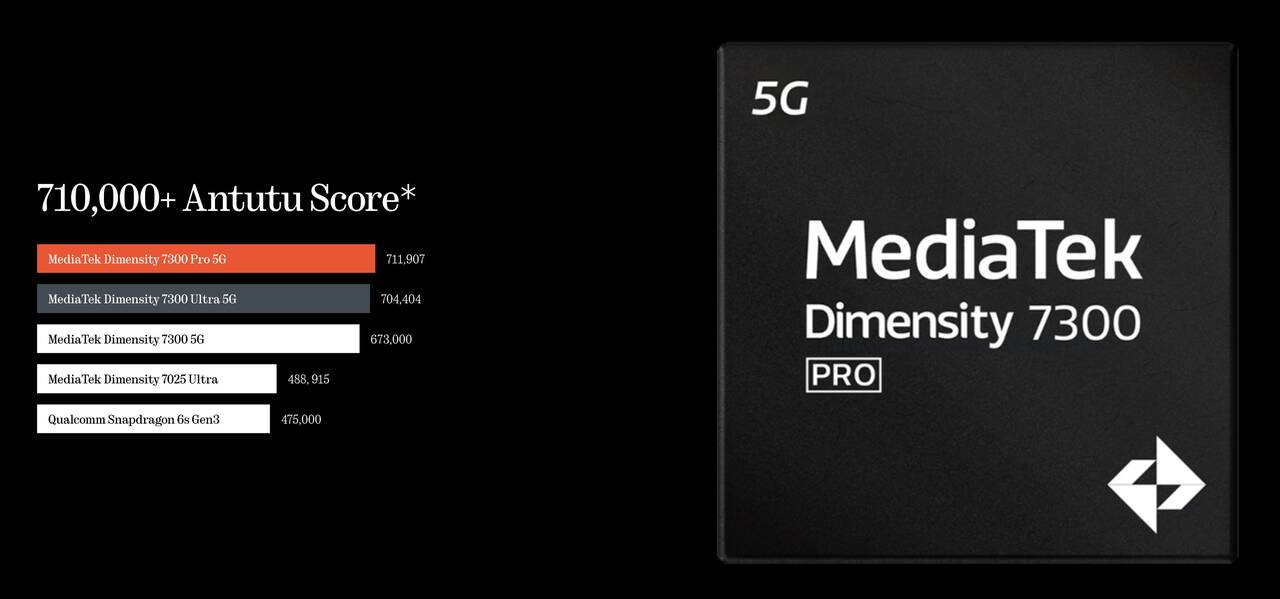 SoCはDimensity 7300 Pro 5Gを搭載!AnTuTuは総合スコアが71万点オーバーとのこと!