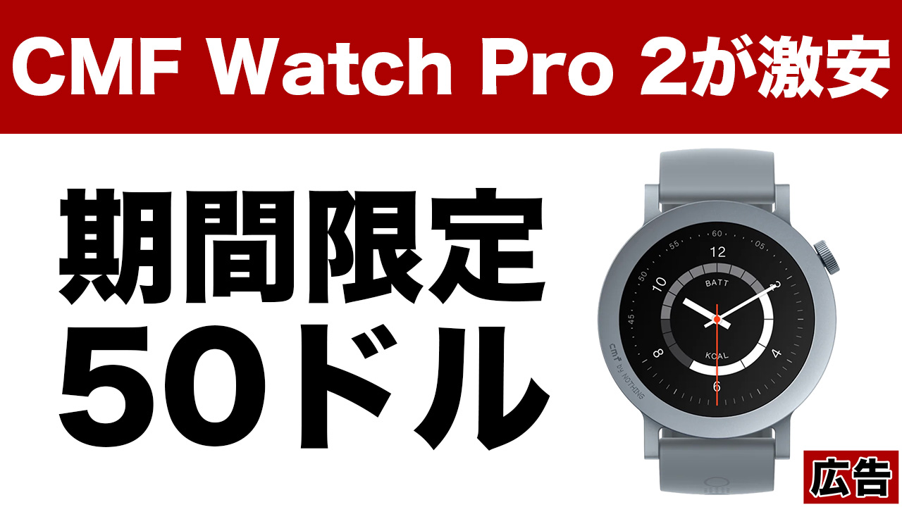 NothingのCMFブランドがリリースするスマートウォッチ「CMF Watch Pro 2」が期間限定で50ドルの大特価になっています。日本で購入するよりも3,000円以上もオトク。狙っていた人はぜひ検討してみて下さい!