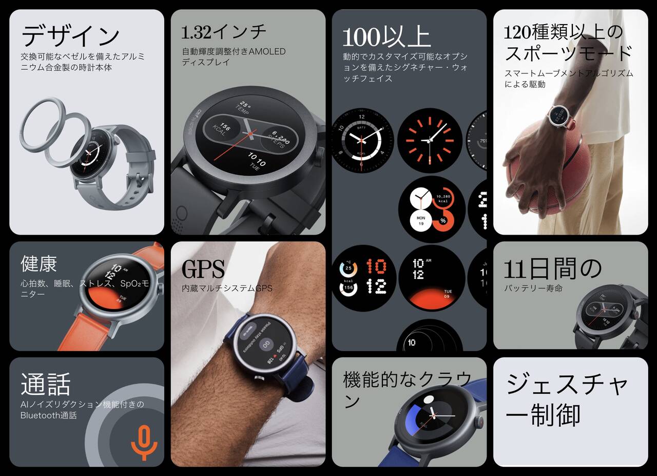 その他、Bluetooth通話に対応、IP68の防水防塵、バッテリー持ちはヘビーユースモードで9日間となっています。