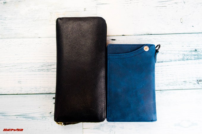 ▼長財布と比較しても収納力は大きく変わらず、厚みもほぼ同等でいて後ろポケットから飛び出さない大きさが気に入っています。↓