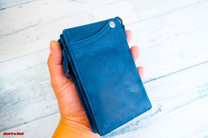 [CORBOの馬革 折財布 8FJ-9979]はバイカーをイメージしている製品で、表のポケットのデザインは革ズボンのポケットをイメージしたデザインとの事。