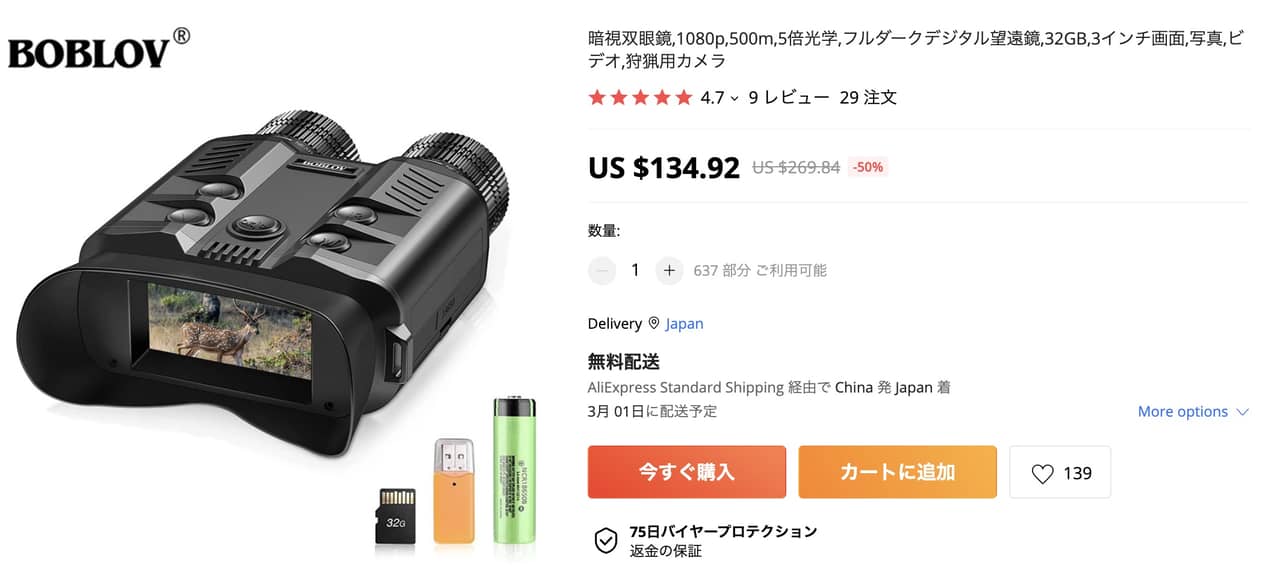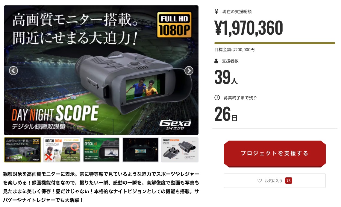 ▼例えば以下の製品。執筆時点でCAMPFIREにてクラファン中のデジタル双眼鏡。一般販売価格は69,800円とのこと。↓