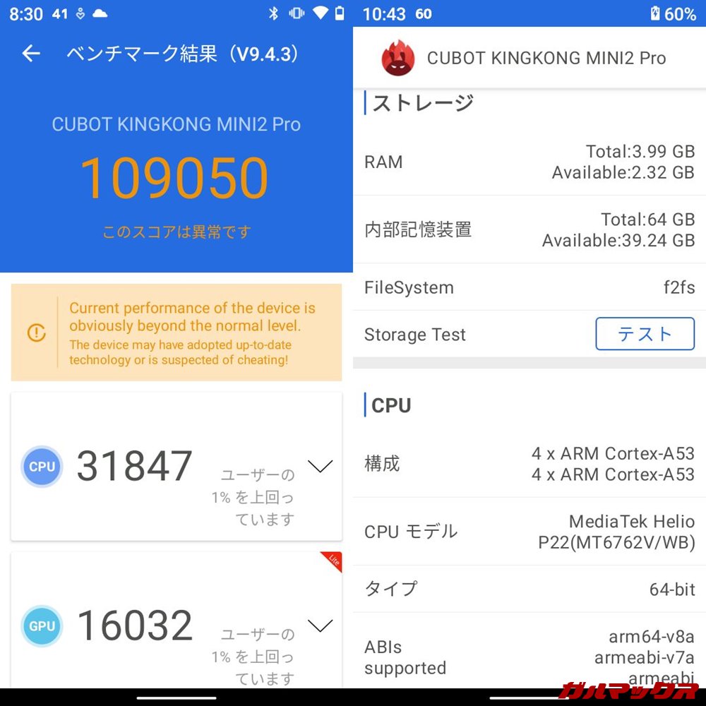 CUBOT KingKong Mini 2 Pro/メモリ4GB(Helio P22)の実機AnTuTuベンチマークを掲載しています。