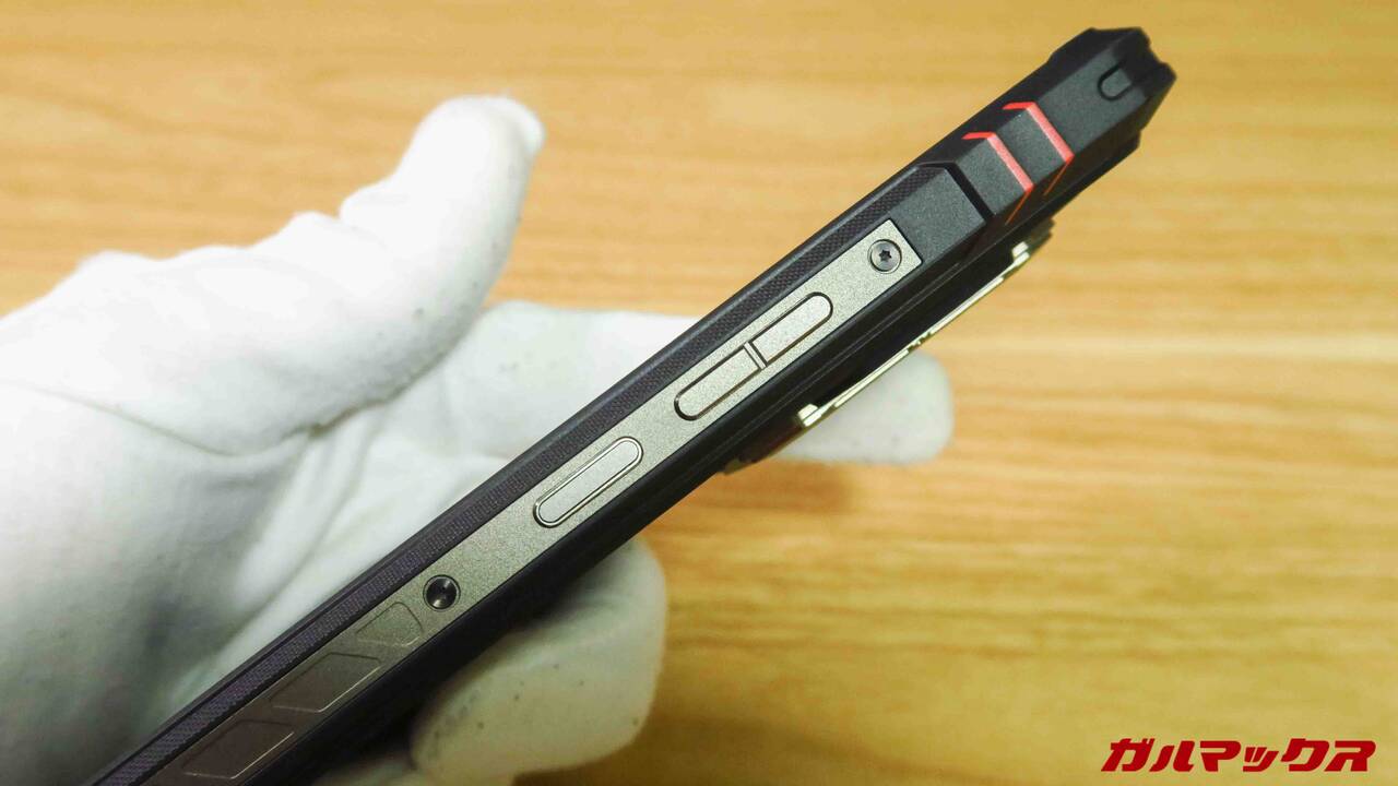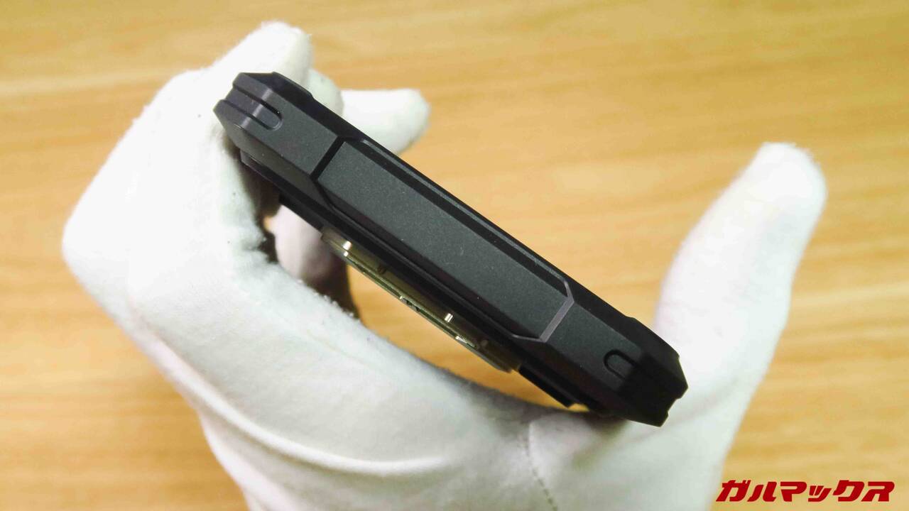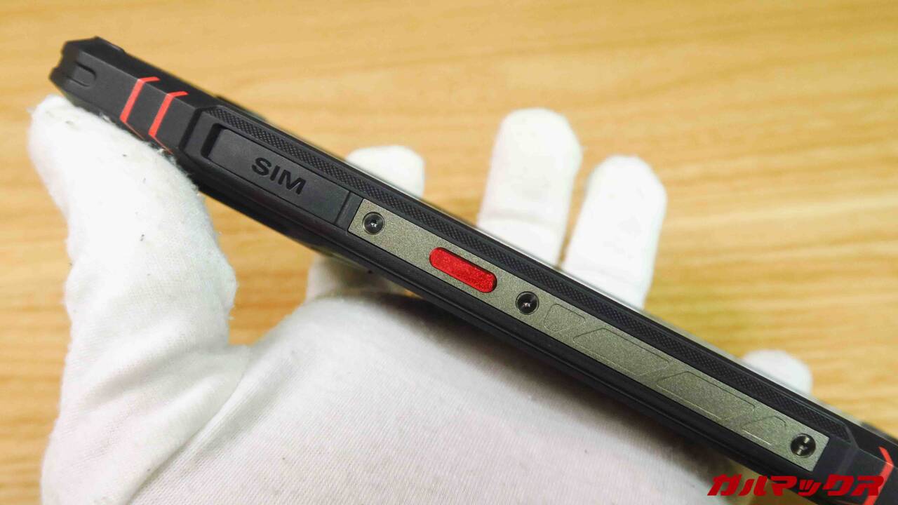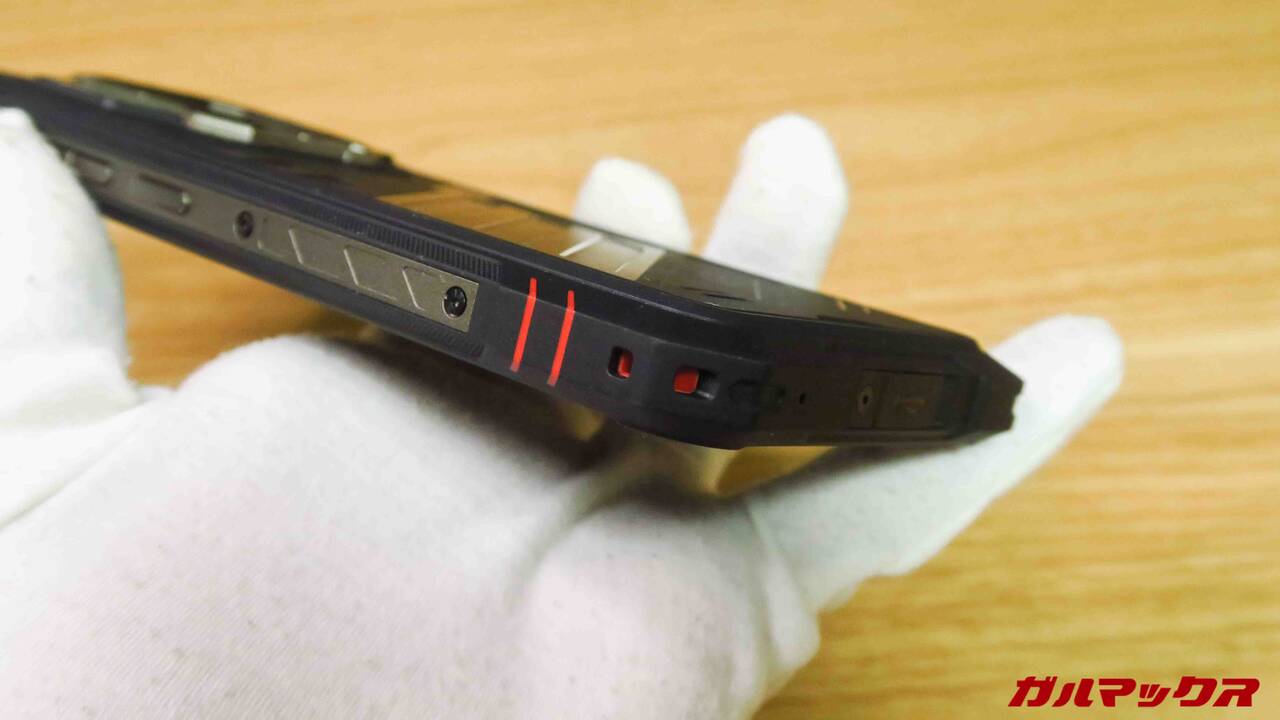 ▼側面はこんな感じ。左側に独自に設けられた赤色のファンクションキーが配置されていました。ファンクションキーはアプリのクイック起動やスクショ、ライト点灯などで使える便利なタフネススマホ特有のギミック。↓