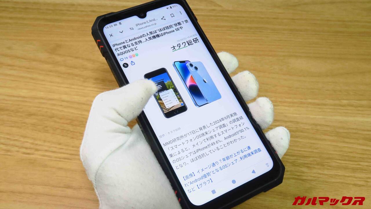 CUBOT KINGKONG STAR2のディスプレイは6.72インチ、液晶で水滴ノッチタイプ。大画面ですがFHD+解像度の2,400×1,080でドットの粗さを感じにくいのがGood。また視野角は広く発色も良好でした。