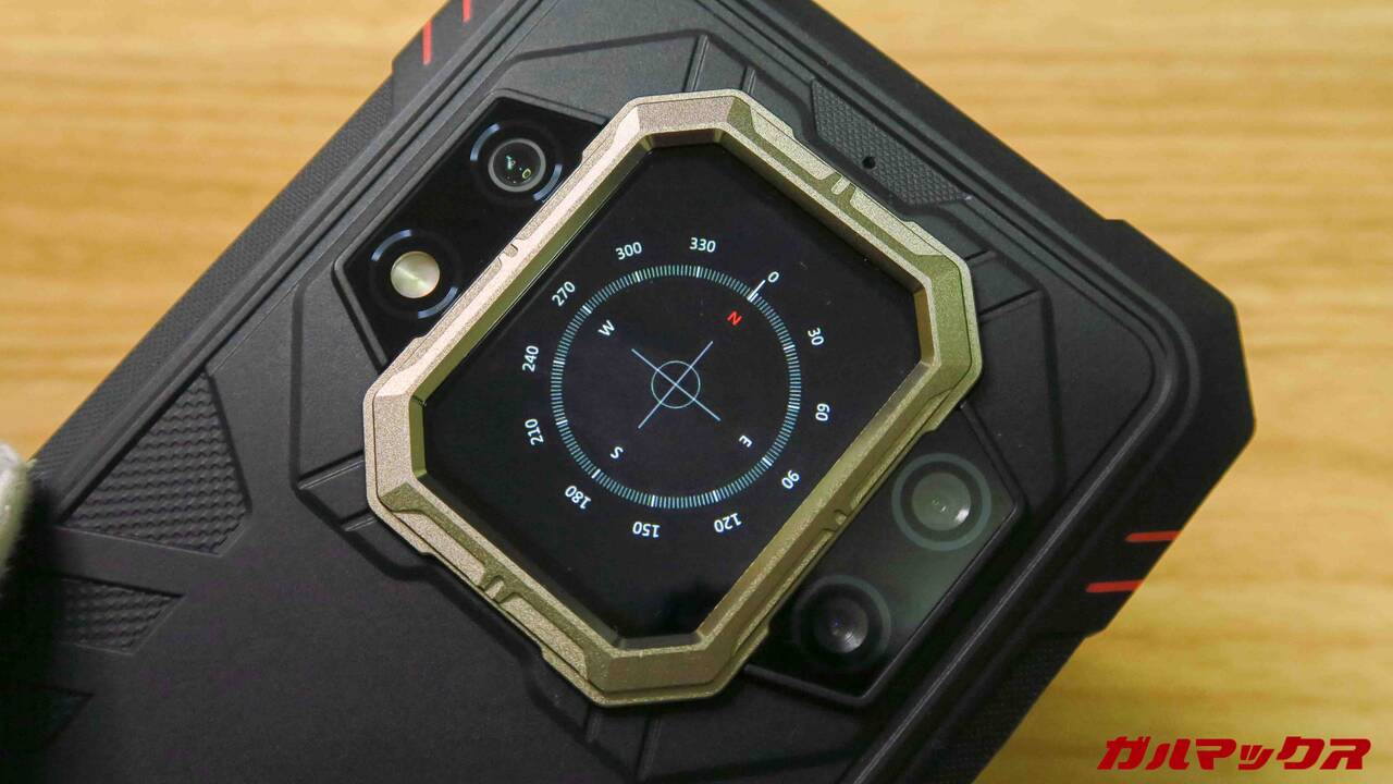 ▼個人的に一番使えた機能はコンパス。アプリで開くの面倒くさいけど、背面だったらひっくり返すだけでOK。ただし電池消費はえらいことになる。↓