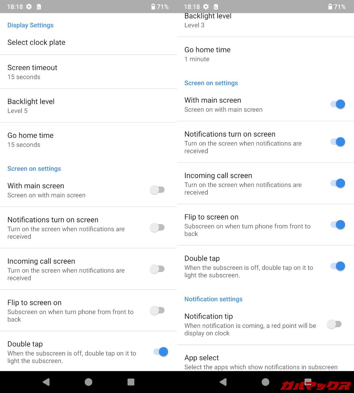 ▼この背面ディスプレイは本体設定からMiniScreenって項目で各種設定ができ、タイムアウトまでの時間だったり○分後に待ち受けに戻るとか画面の輝度といった色々設定が組めます。また簡易的な使い方のガイドもありました。↓