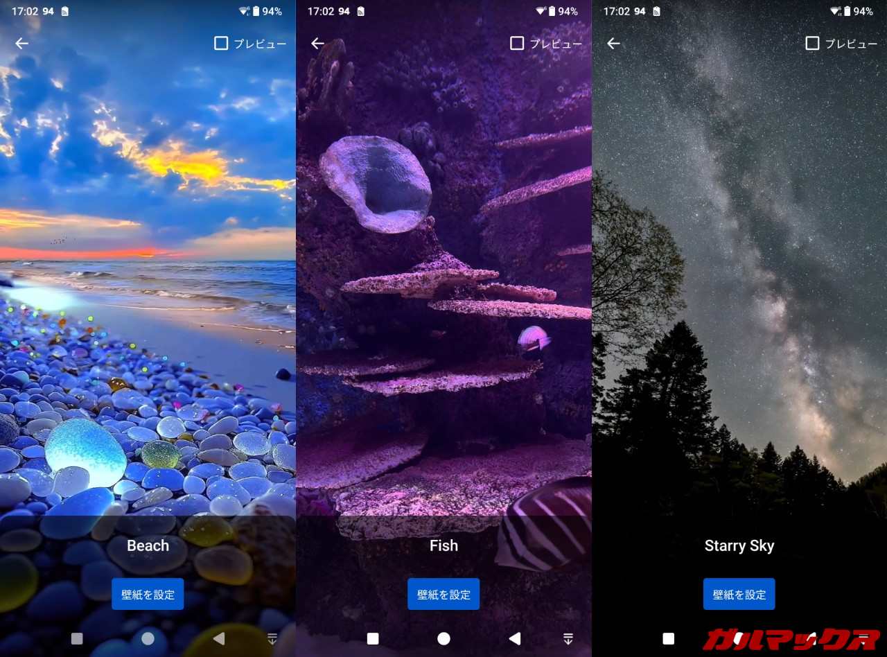 ▼種類は3つあり、ビーチとサンゴ礁と夜空の風景。動画になっており、動く壁紙になります。↓