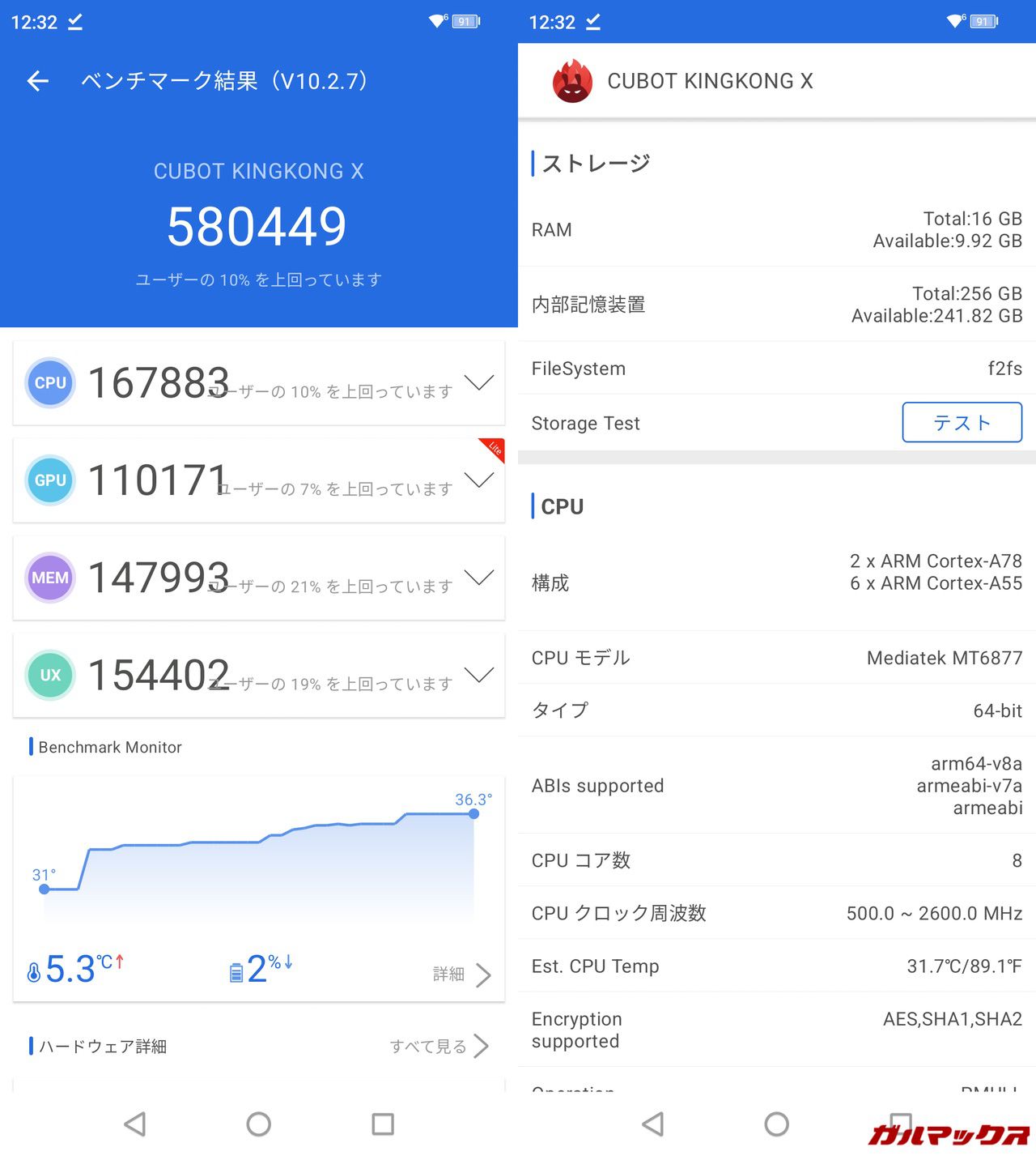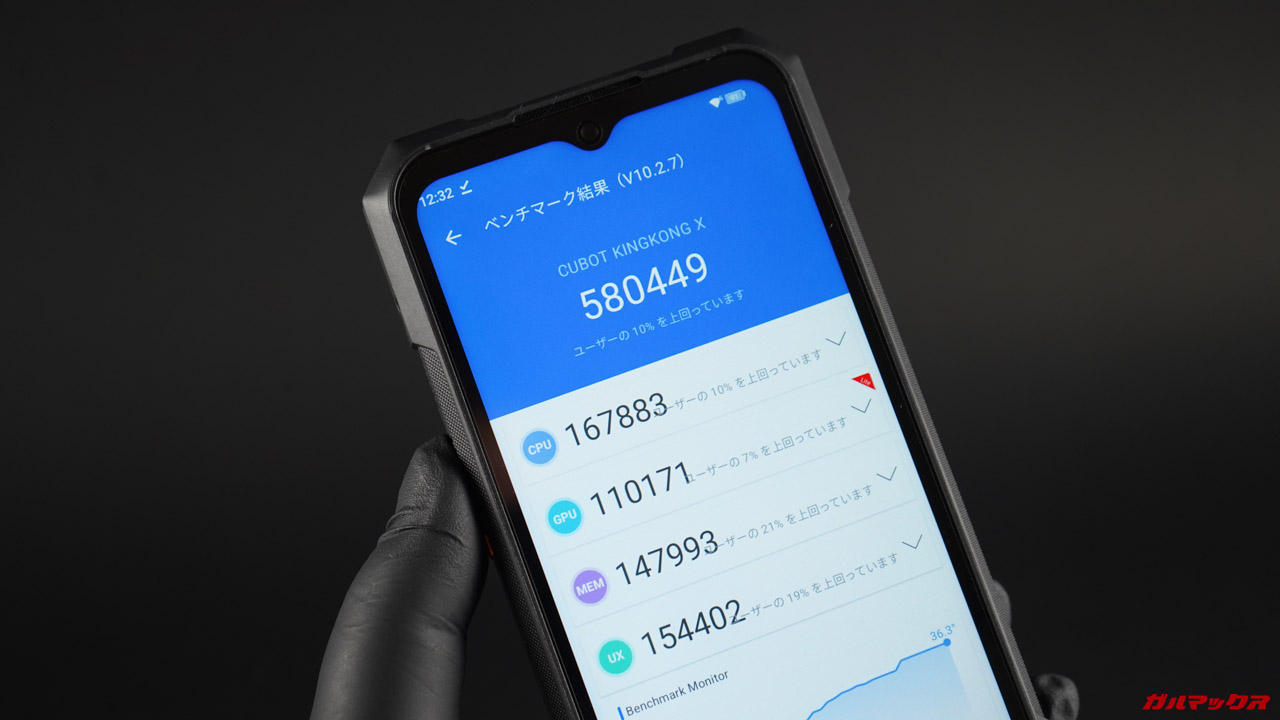 性能を数値化するAnTuTuベンチマークスコアは総合スコアが580,449点、GPUスコアが110,171点!ミドルとしては非常に高い性能を持っています。Snapdragon 6 Gen 1と良い勝負って感じですねぇ。