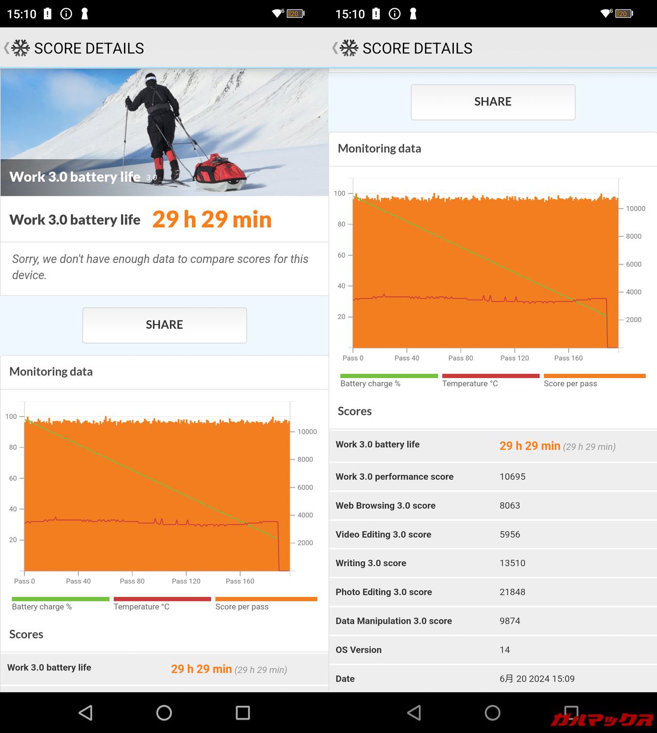▼上にも貼り付けてますがバッテリー持ちはこんな感じ。これ、100%→20%の時間なので、ギリまで使えば30時間以上は確実に動き続けます。↓