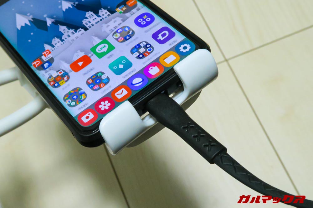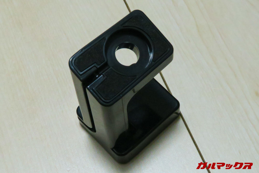▼これは純正の充電器をはめ込むことで充電スタンドに進化させられるシロモノなんす。110円ですが質感が結構良いし、溝にケーブルをはめ込んでおけるためスマート!↓