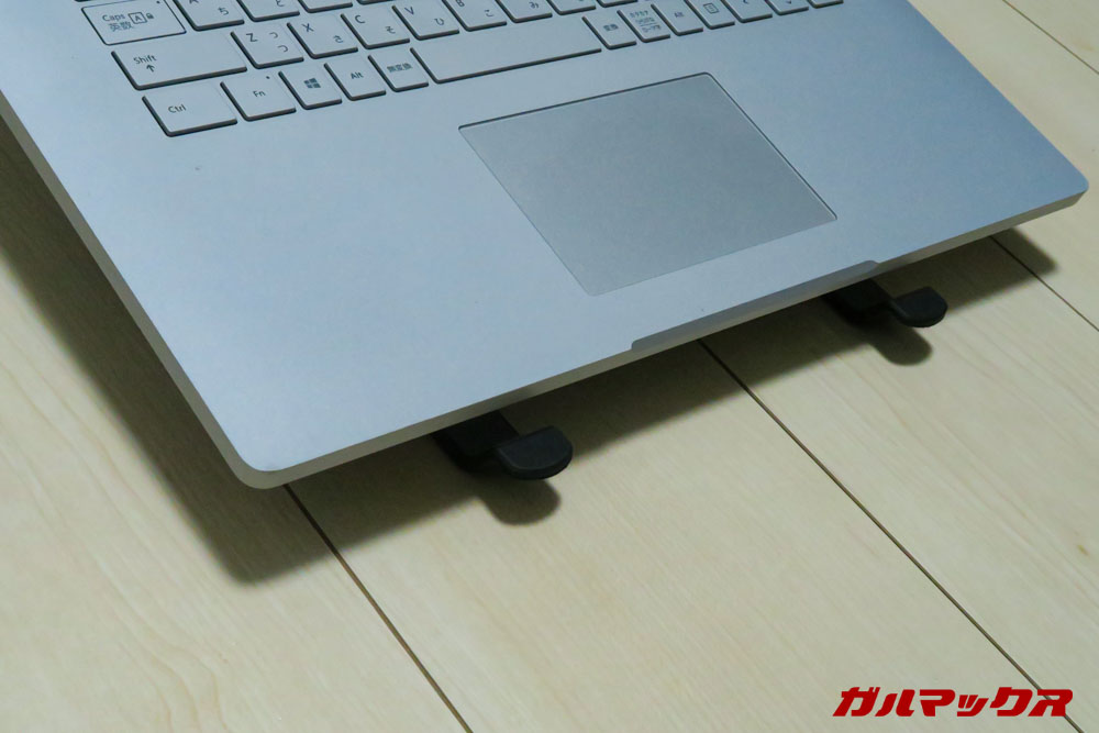 ▼対応するパソコンであれば浮かせられることでタイピングしやすくなり、さらに熱もこもらず冷却効率も目に見えてよく感じられました!↓