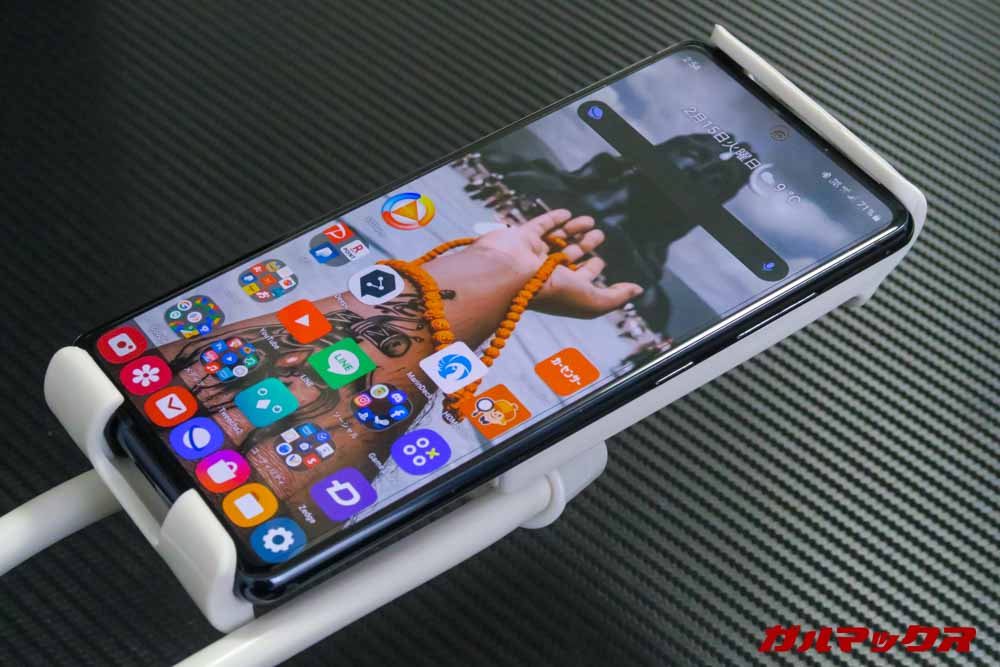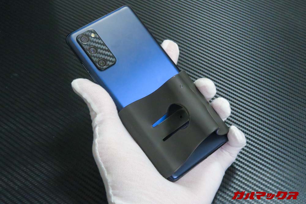 ▼ツメ部分もカーブしつつ奥行きも十分で、6.5インチスマホのGalaxy S20 FE(本体厚み8.4mm)もしっかりハマります。↓