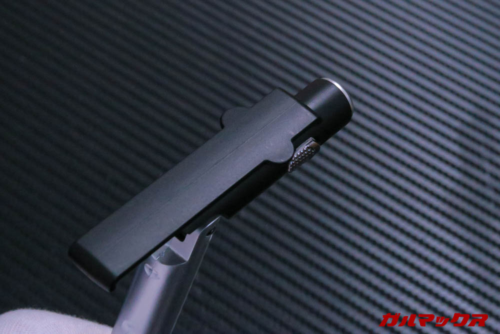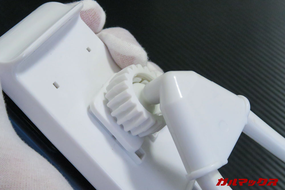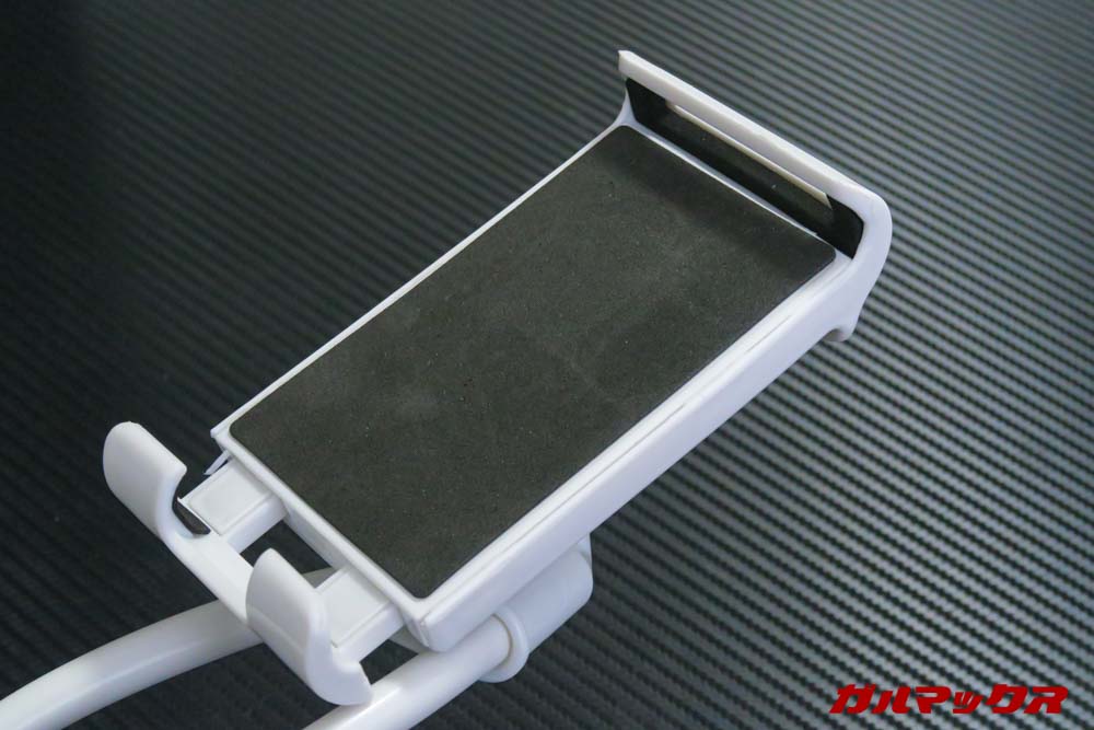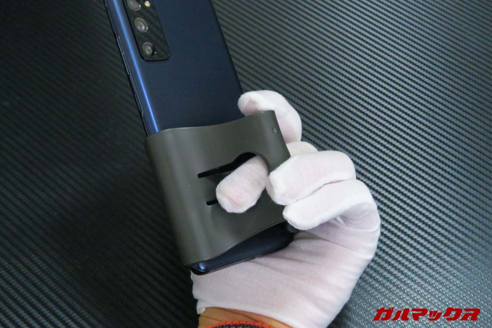 さらに内部の調節バンドで幅を調節することで小さいモデルでも挟めるようになっているほか、掴む部分の形状は真ん中が凹んでいるおかげで左右からスワイプ操作がしやすいのも工夫されてて凄いと思えました。
