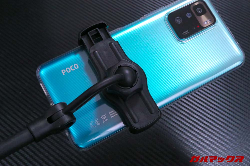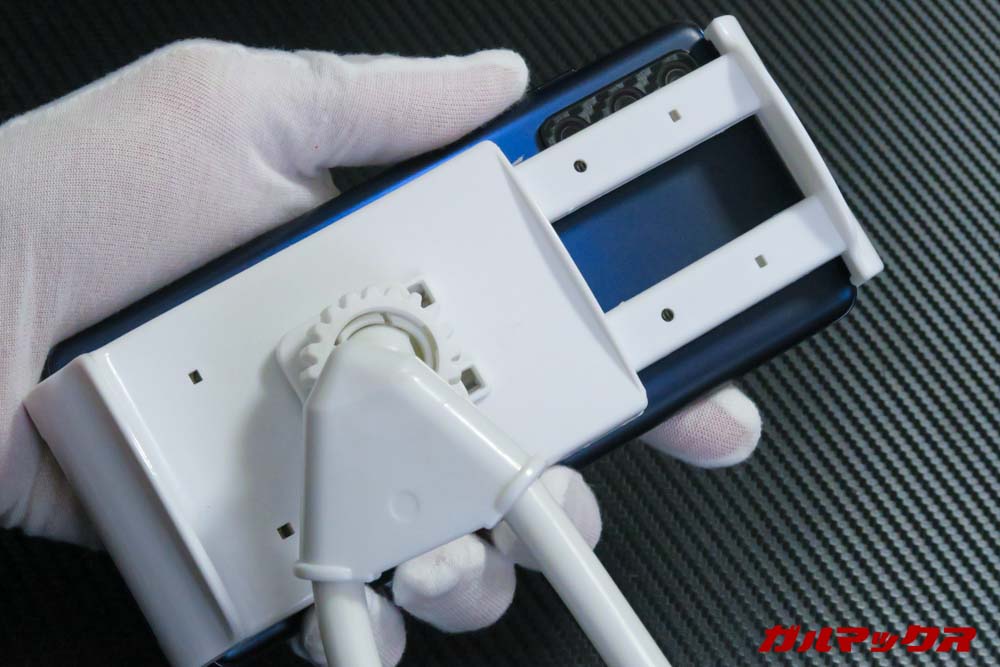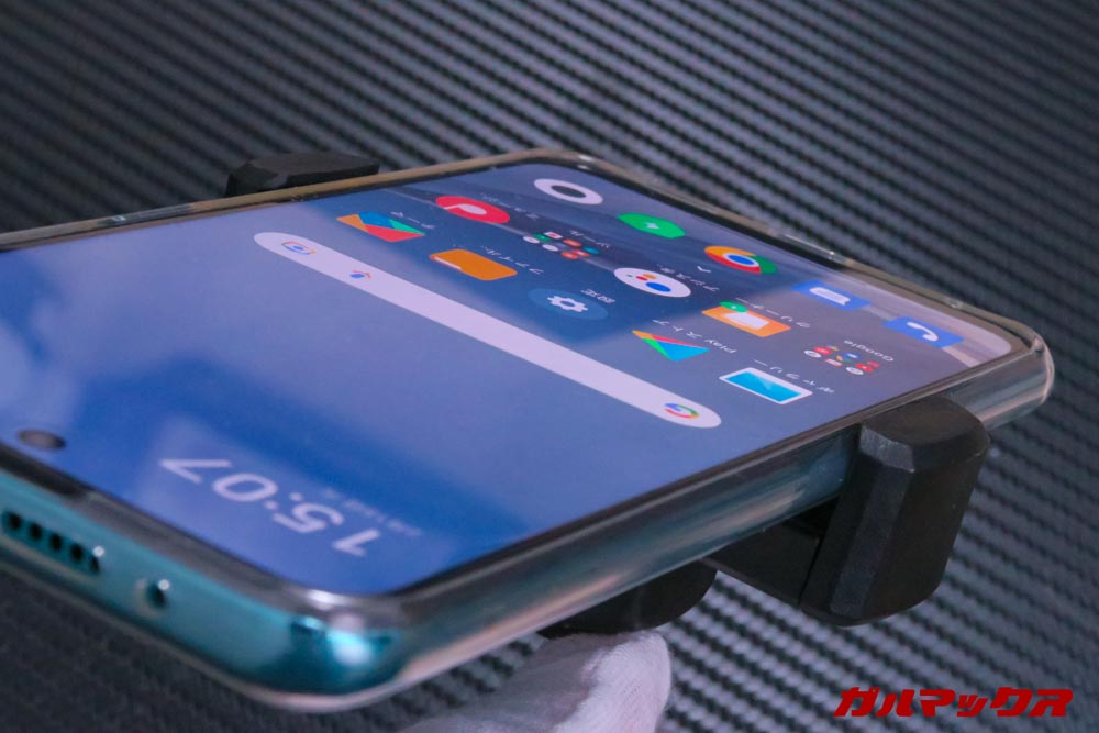▼欠点として、ホルダー部分のツメが浅いため、ケースを付けたスマホでは奥行きがかなりギリギリになってしまいます。厚みのあるタフネススマホや背面リングを付けているスマホだと脱落しやすいので向きません。ケースを外しての運用が良いっすね。↓