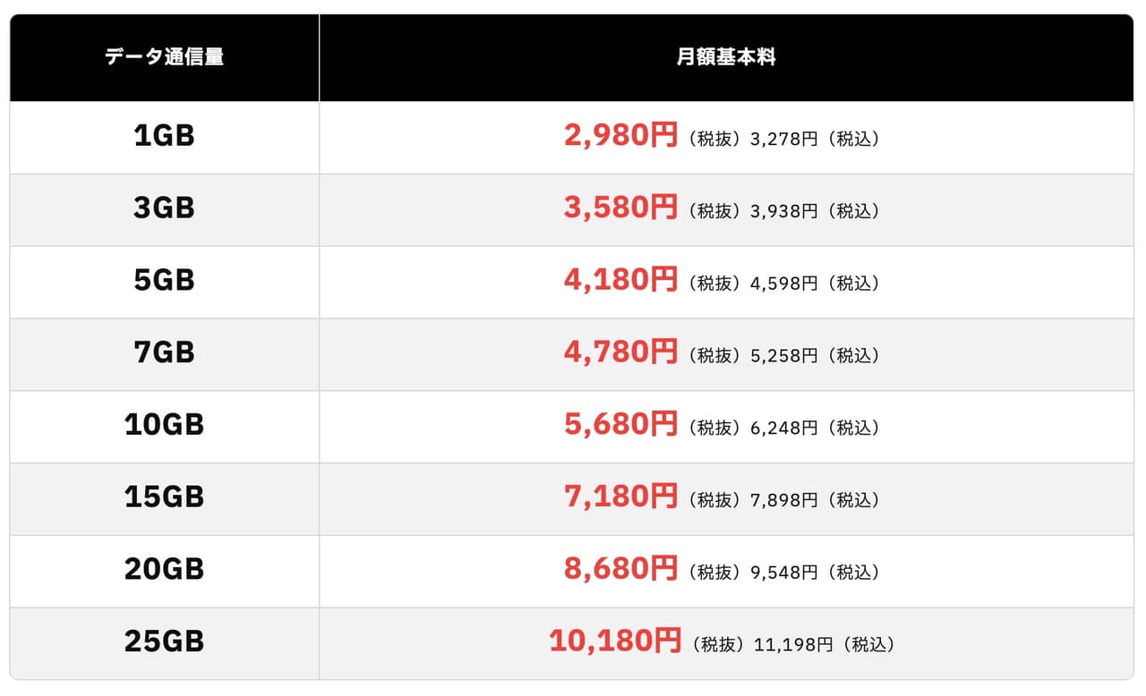 特徴は全プラン24時間の通話かけ放題付き。スマートフォンの一般的な料金プランと比較するとかなり割高ですが、データ通信量も複数用意されていてピッタリな容量を選びやすそうです。契約しているデータ容量を使い切ったら1GB/550円で追加もOK。