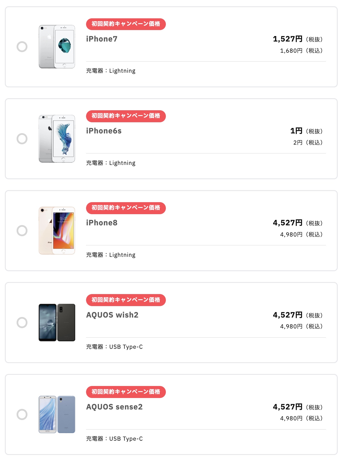 ▼誰でもスマホは契約時に格安のスマホも一緒に購入可能。執筆時点では以下のラインナップでした。↓