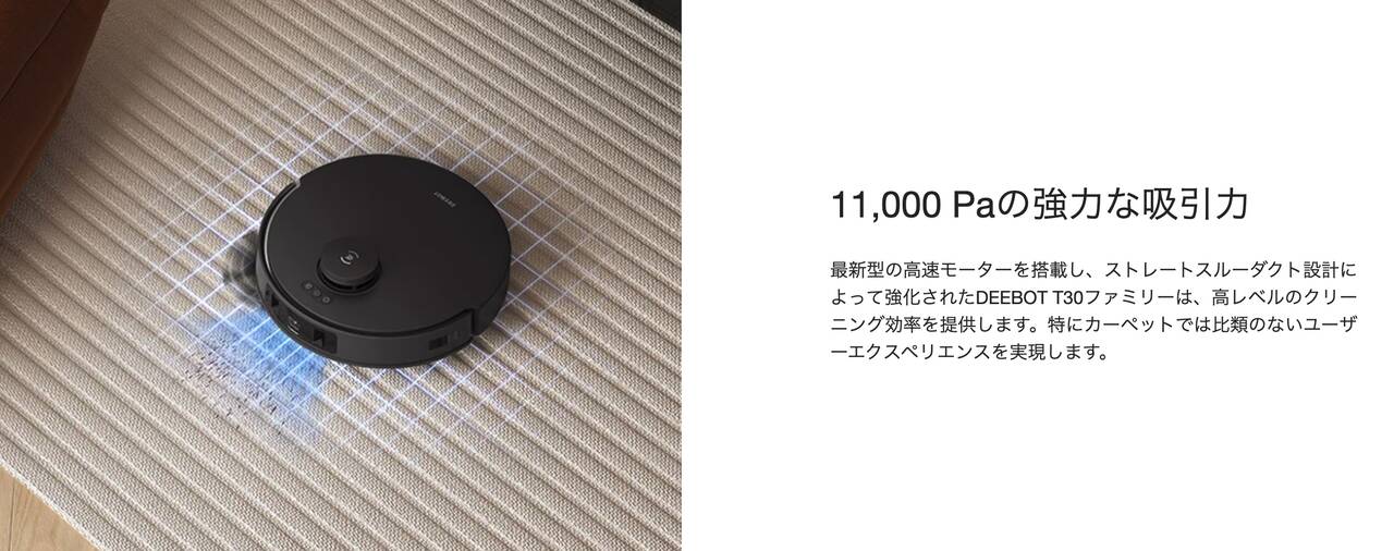 ロボット掃除機の吸引力はまちまちで、だいたい3,000〜5,000pa、強力なもので8,000paという製品もありますが、DEEBOT T30 OMNIは脅威の11,000pa!