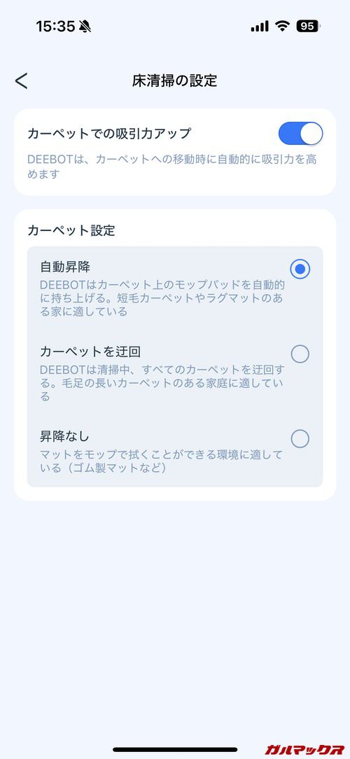 ▼モップ設定ではカーペットも吸引掃除(モップは9mmのリフトアップ機能が付いているので薄手のカーペットは濡れにくい)するか迂回するか選べます。↓