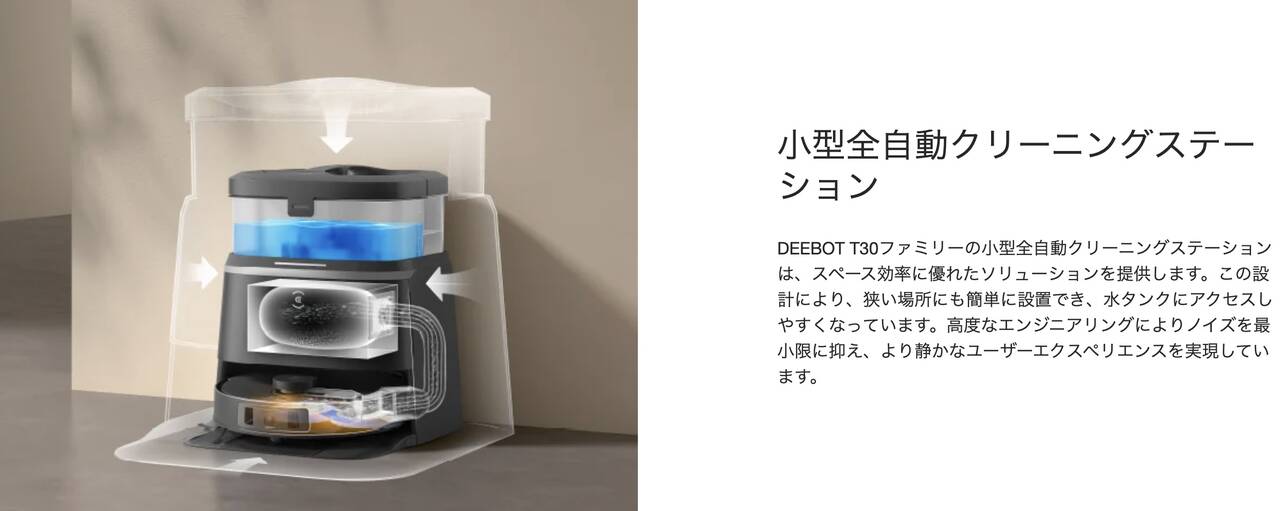 ロボット掃除機の全自動モデルは、水拭き用の清水・汚水タンクや自動ゴミ収集のダストバッグがステーションに内蔵されています。なので大型なモデルが多いんですが、DEEBOT T30 OMNIはステーションがとっても小さい!