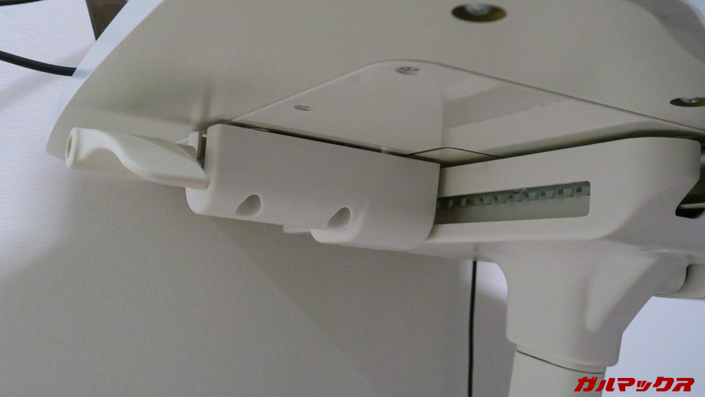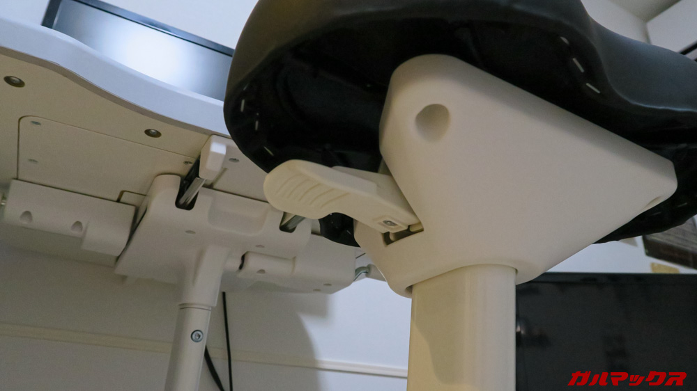 ▼ウラには左右に調節用レバーが配置されており「左側はデスクの位置」「右側はデスクの高さ」を調節できるんす。調節幅はかなり広く、さらに細かい位置に合わせられるので柔軟に位置を決められてGood!↓