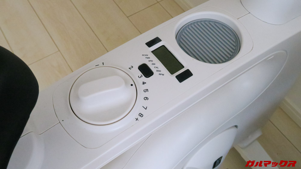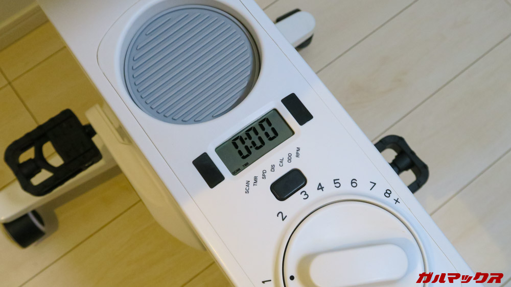 ▼その下のダイヤルはペダルの強度で、いわば自転車でいうギア。数値がデカいほどペダルが重くなるので、運動負荷の細かな調節が聞く仕組み!回し心地は結構硬い。個人的には3~4ぐらいが作業しながら漕ぐのにちょうどよく感じます。↓