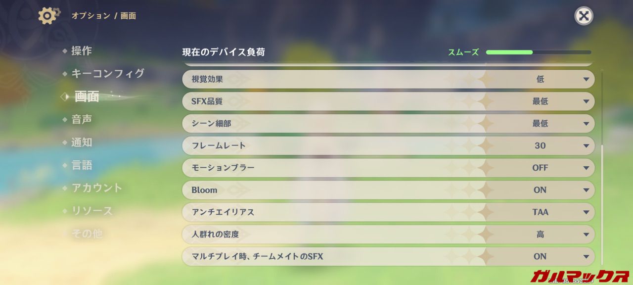 検証では画質を「中」、フレームレートを60に設定してマップの3箇所をワープ後に4キャラ分の元素爆発を連続発動した際の高負荷状態で下限フレームレートを測定します。