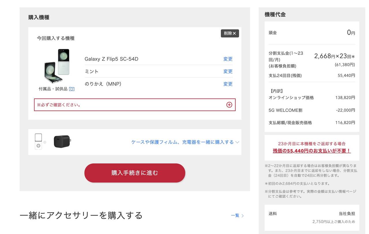 Galaxy Z Flip5 SC-54Dが16万820円→13万8820円!2年レンタル時は6万1380円