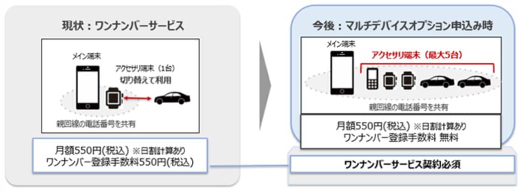 ▼これまではスマホ+1つの対応アクセサリーで1つの電話番号を共有できる「ワンナンバーサービス」が提供されていましたが、今回のマルチデバイスオプションはさらに範囲を拡大できる上位オプションとなります。↓