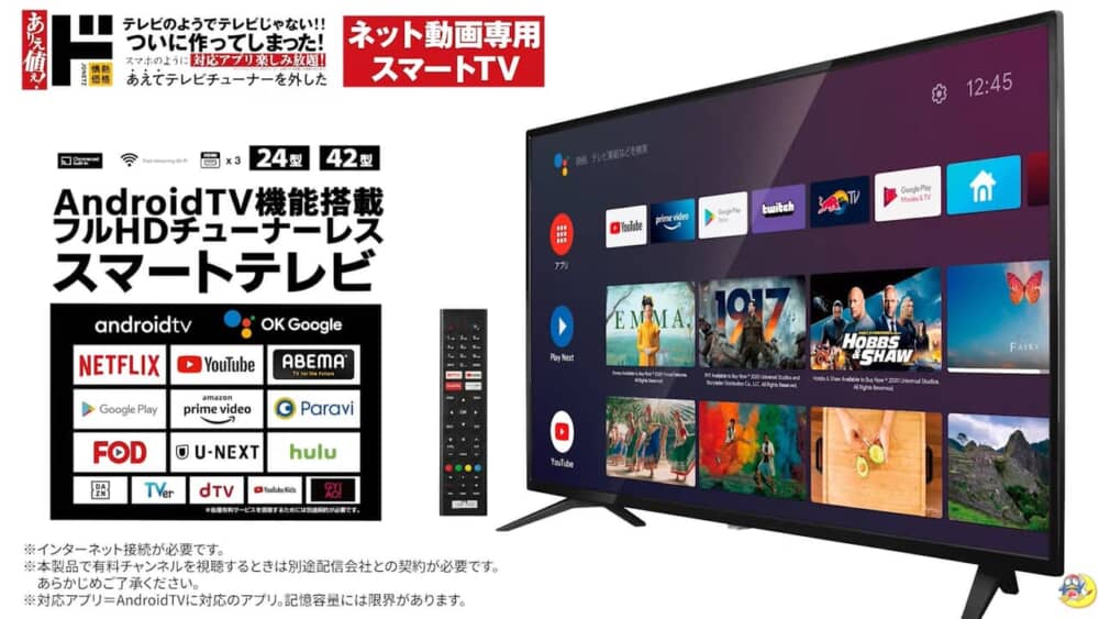 ドンキホーテの情熱価格よりAndroid搭載スマートテレビ「TSM-2401F2K」「TSM-4201F2K」が発表されましたよ!テレビチューナーを廃し、Androidを内蔵したため単体でYouTubeやプライムビデオといった動画を楽しめるモデルで非常に気になる!