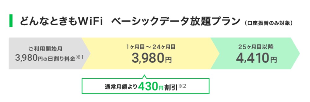 キャンペーン適用で2年間は月額3,980円。クレジットカード払いよりちょっぴり高くなるけど、クレジットカード持っていないからモバイルWi-Fiルータの契約自体が厳しいって方は神対応です。